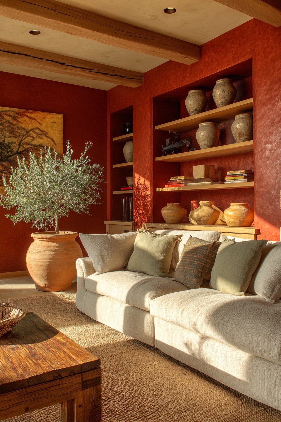 Rust is the more accessible sibling of burgundy — slightly more orange, slightly more casual. It works brilliantly as an accent throughout neutral interiors. Rust cushions, pottery, and textiles bring energy and warmth to beige or cream rooms. The color has an earthy, artisanal quality that connects seamlessly to terracotta, ochre, and warm wood tones.