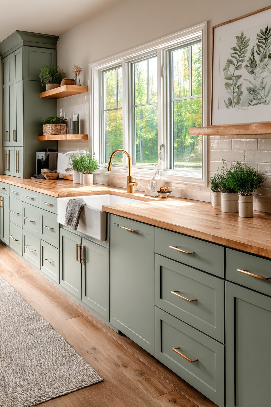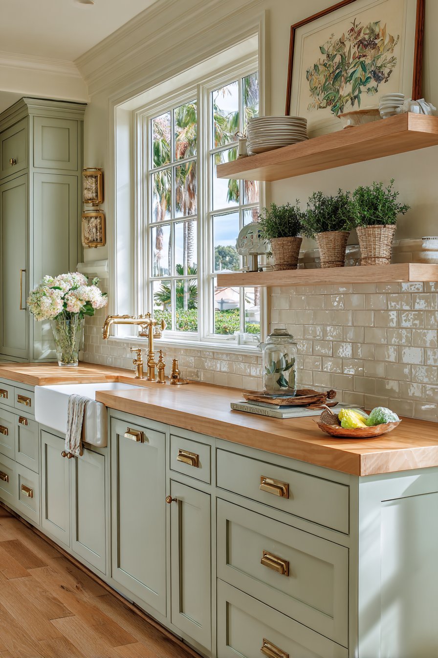 - Paint lower kitchen cabinets in sage green while keeping uppers white