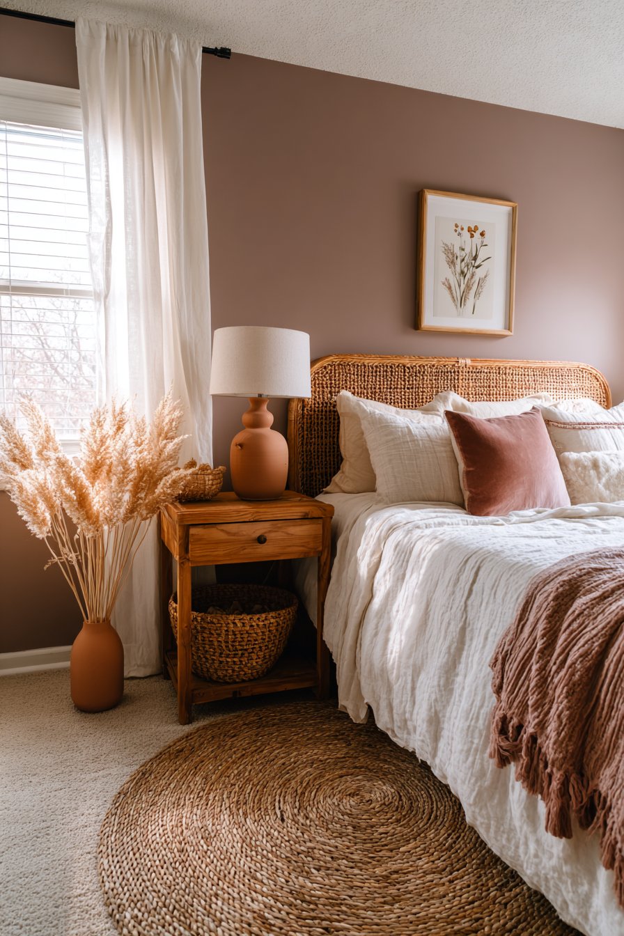 - Use dusty mauve on bedroom walls with warm white trim for contrast