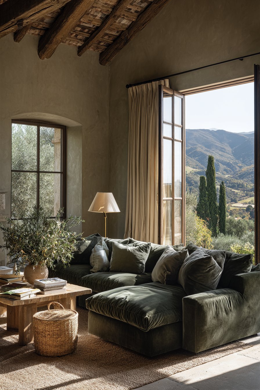- Layer green tones in pillows, throws, and art for a cohesive look