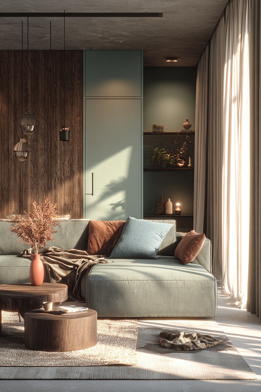 Sage green reflects light beautifully without creating harsh glare. This makes it ideal for rooms with large windows where diffused sunlight can create a soft, ethereal atmosphere. Brown accents absorb light selectively, adding depth and preventing the space from feeling washed out. The interplay between these reflective and absorptive qualities creates visual interest without stimulation.