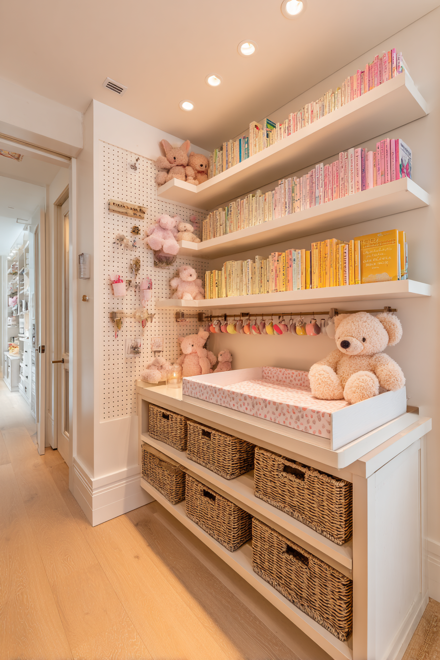 Pegboards offer another versatile vertical solution for small nurseries. Mount them at changing table height to hang baskets, hooks, and organizers that keep supplies visible and accessible. The customizable nature of pegboards means you can adjust the configuration as your baby’s needs change, making it a flexible storage system that grows with your child.