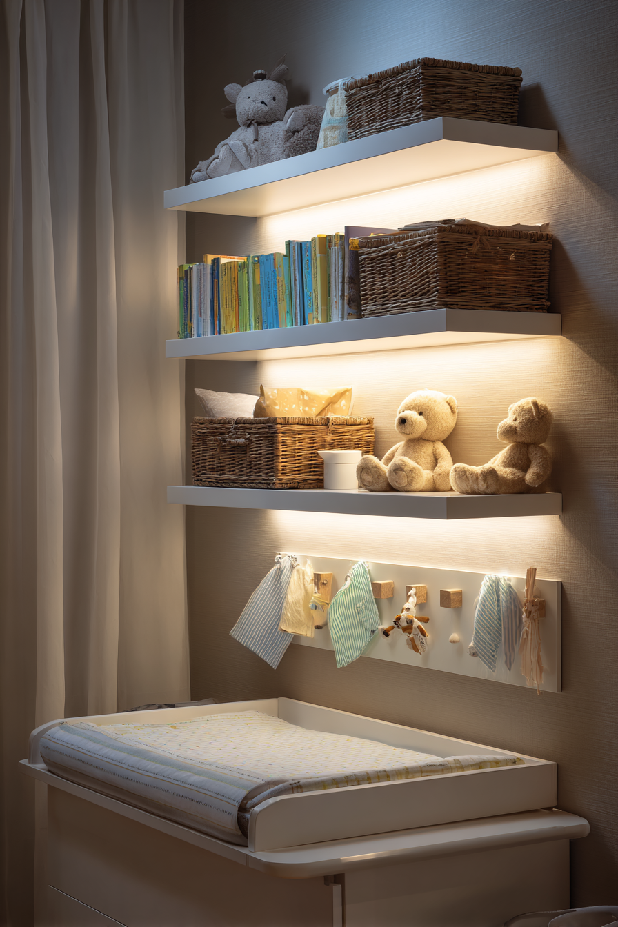 When floor space is limited, vertical storage becomes your greatest ally in nursery organization. Wall-mounted shelves installed above changing areas or the crib keep essential items within reach without consuming precious square footage. Floating shelves create visual interest while providing practical storage for books, decorative items, and daily necessities.