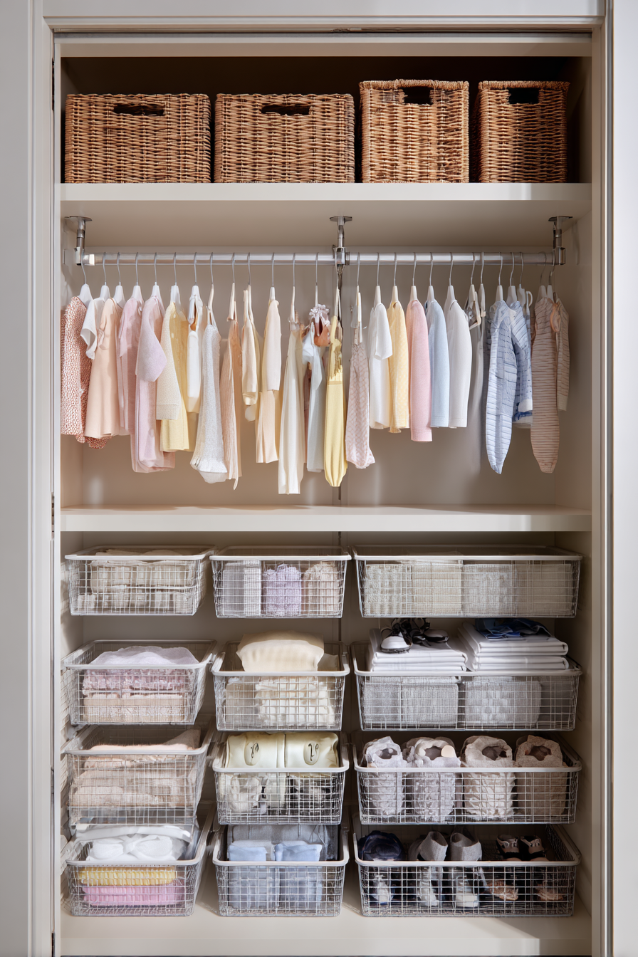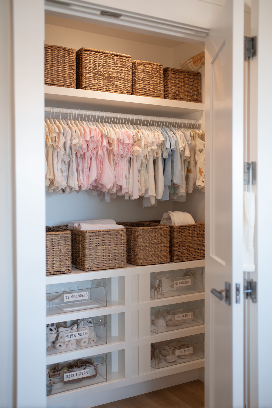 Divide the closet into zones for different categories of items. The top section stores seasonal clothing and items you’ll need later. The middle zone holds everyday essentials at eye level for easy access. The bottom section can accommodate bins for toys, books, or bulky items like extra bedding and blankets.