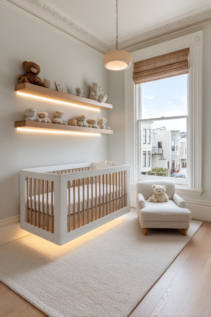 Light, neutral colors are essential for creating the illusion of more space in a small nursery. Whites, soft grays, and pale pastels reflect natural light and make walls appear to recede, visually expanding the room. A monochromatic palette with varying textures adds depth without the visual clutter that bold patterns can create.