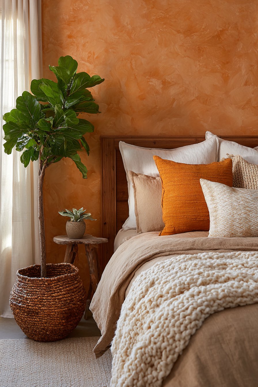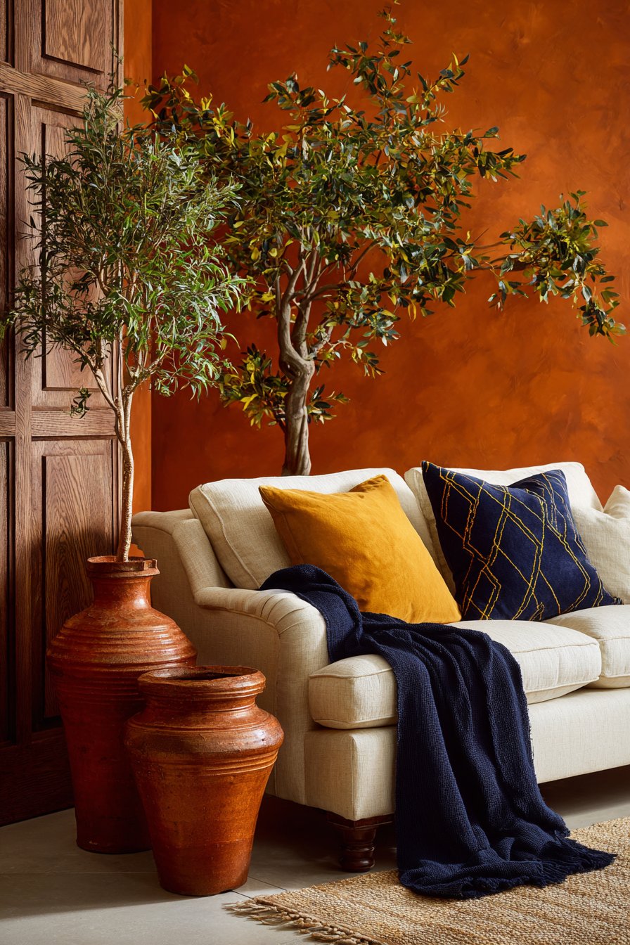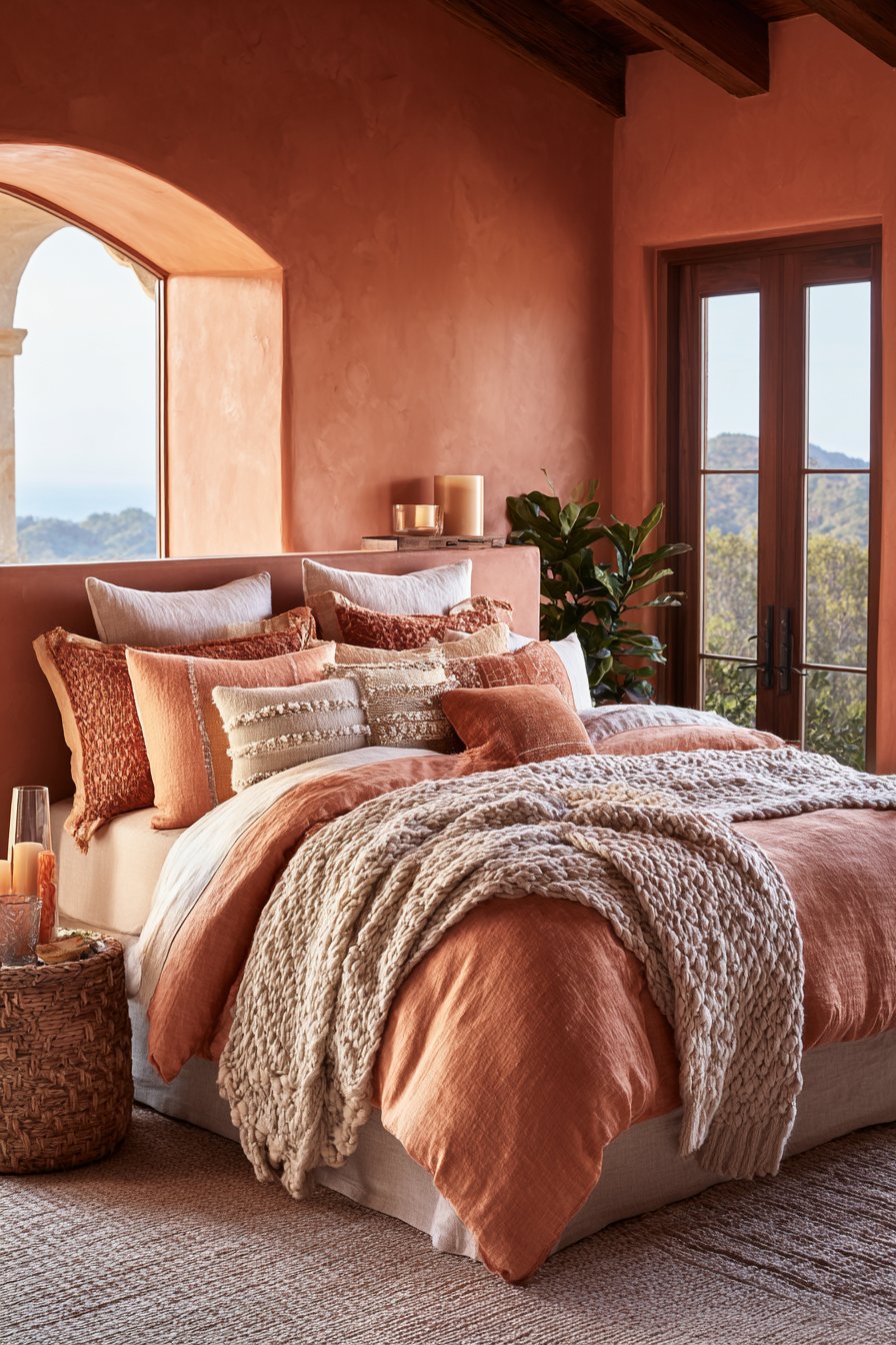 When layering textiles, think about tonal variation. A deep burnt sienna throw alongside a softer, peachy terracotta cushion creates dimension and prevents the look from appearing flat. Mix textures too — rough-woven linen with smooth velvet, or chunky knit with fine cotton — to keep the eye moving and the space feeling rich and considered.