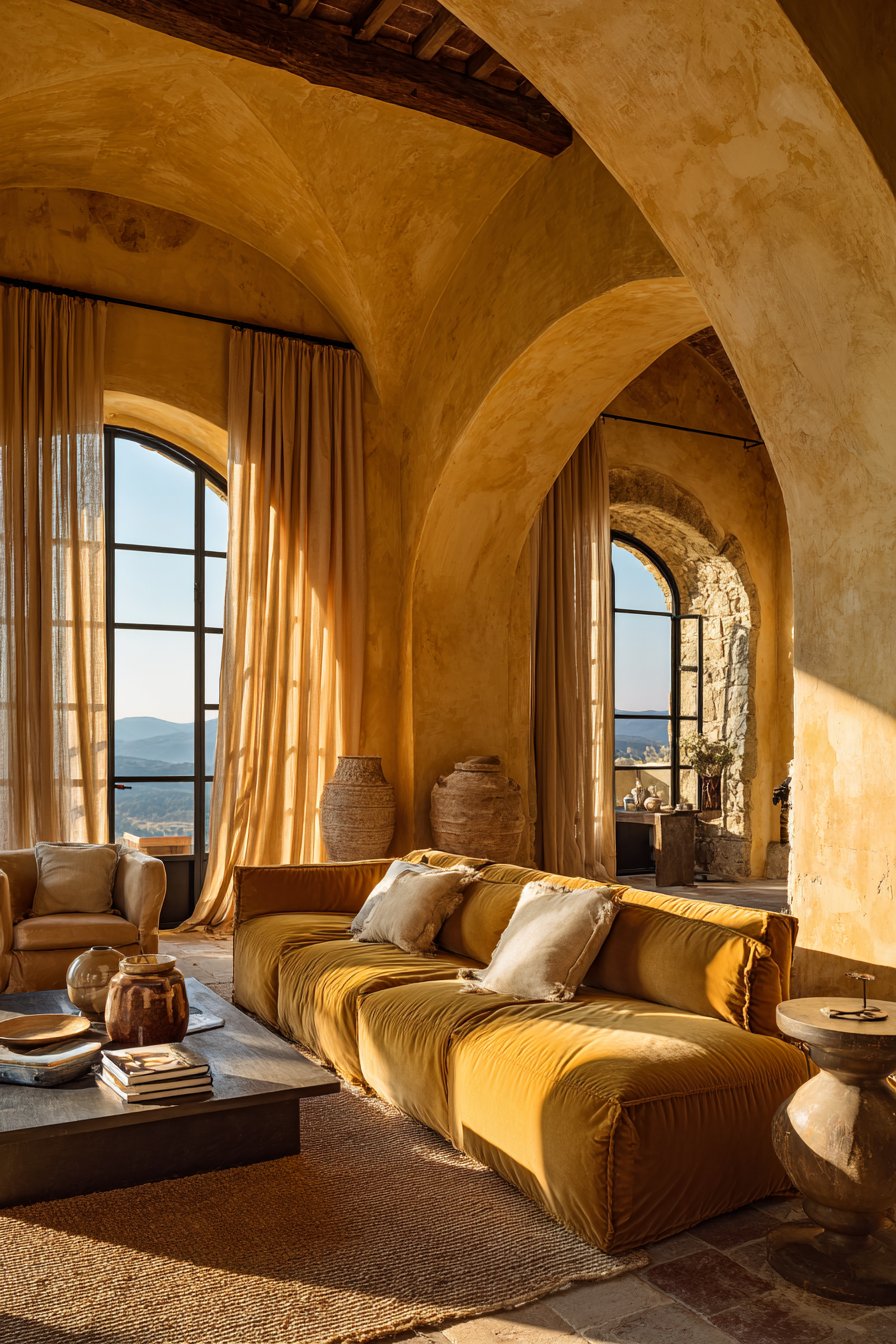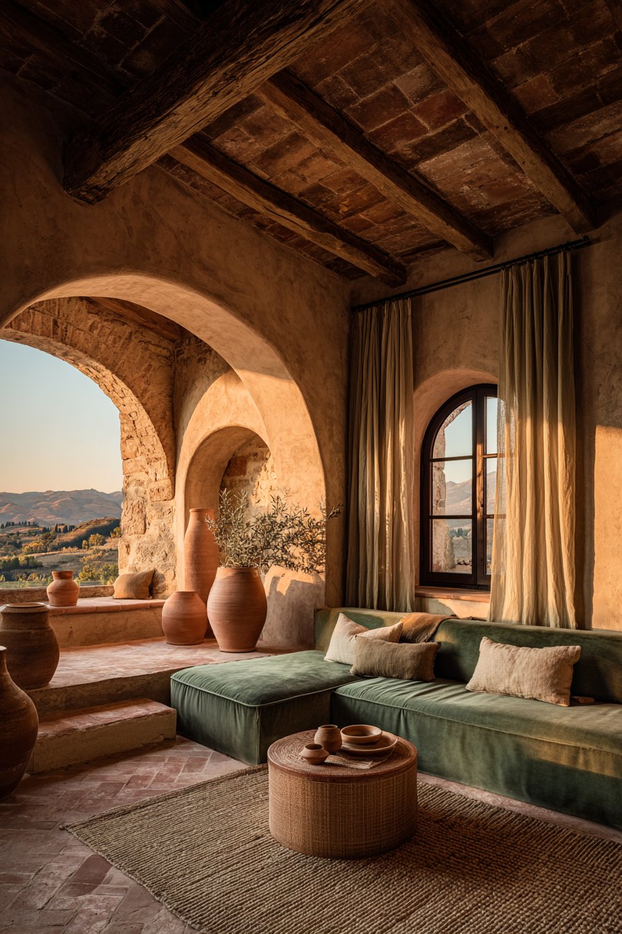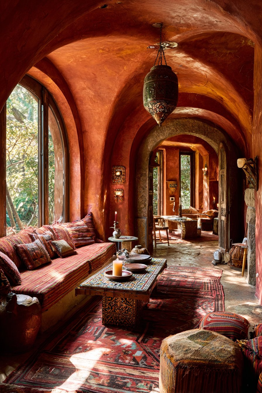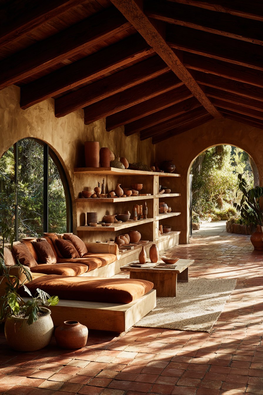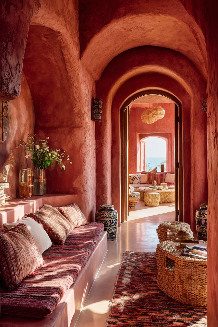 In Mediterranean and Moroccan-inspired interiors, terracotta is undeniably at home. Arched doorways, mosaic tiles, warm plaster walls, and hand-knotted rugs in terracotta tones create an immersive, sensory-rich environment. The color feels inherited here — as though it grew from the landscape itself.