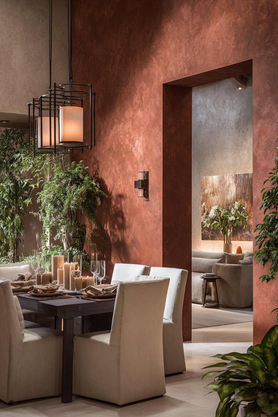 The finish you choose matters enormously. A matte or limewash finish intensifies the organic, aged quality of terracotta — making walls look almost like sun-dried clay. This approach suits bohemian, Mediterranean, and Japandi-inspired interiors. A satin finish, on the other hand, brings a slightly more polished feel, suitable for contemporary or transitional spaces.