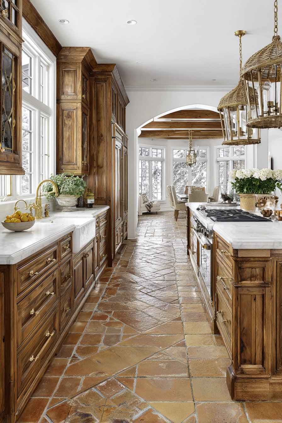 In kitchens, terracotta tiles bring organic texture and warmth to a space that can easily feel clinical. Whether used on the floor or as a backsplash, they introduce natural variation in tone and surface that no manufactured material can replicate. Pair them with warm wood cabinetry and matte brass fixtures for a cohesive, artisan aesthetic.