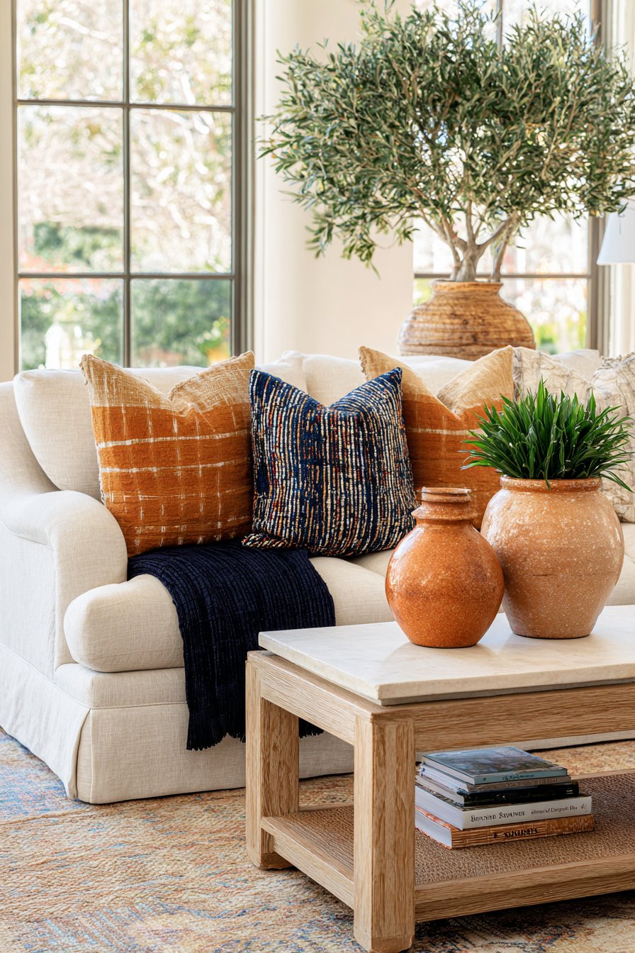 - Mix terracotta textiles with cream, sage green, or warm off-white for balance
