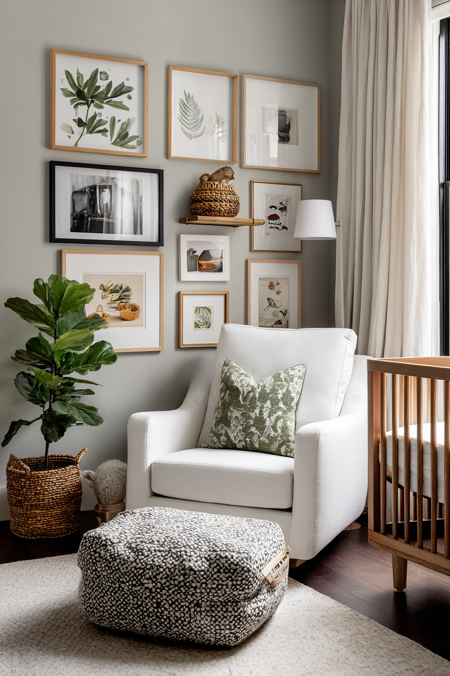Skip the generic animal prints and mass-produced nursery art. A curated gallery wall featuring unexpected pieces adds sophistication and personality that reflects your unique taste. This approach transforms the nursery into a mini art installation that evolves as your child grows.