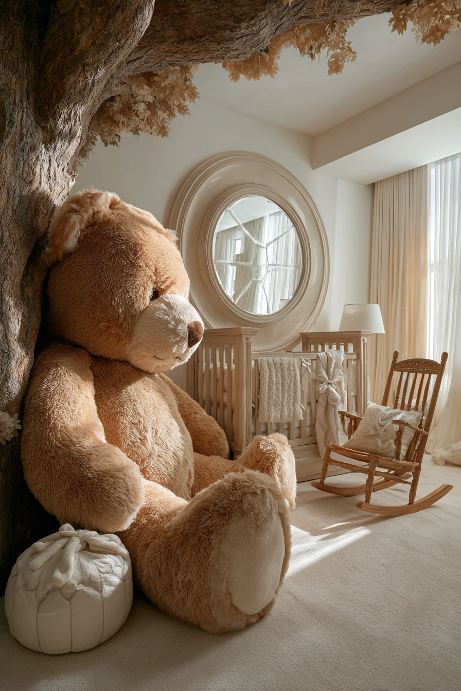 Consider a giant stuffed animal that serves as both decor and floor cushion, or install an oversized mirror that reflects light and makes the room feel larger. On the flip side, tiny furniture pieces like a miniature rocking chair or small bookshelf create cozy reading nooks that feel specially sized for little ones.
