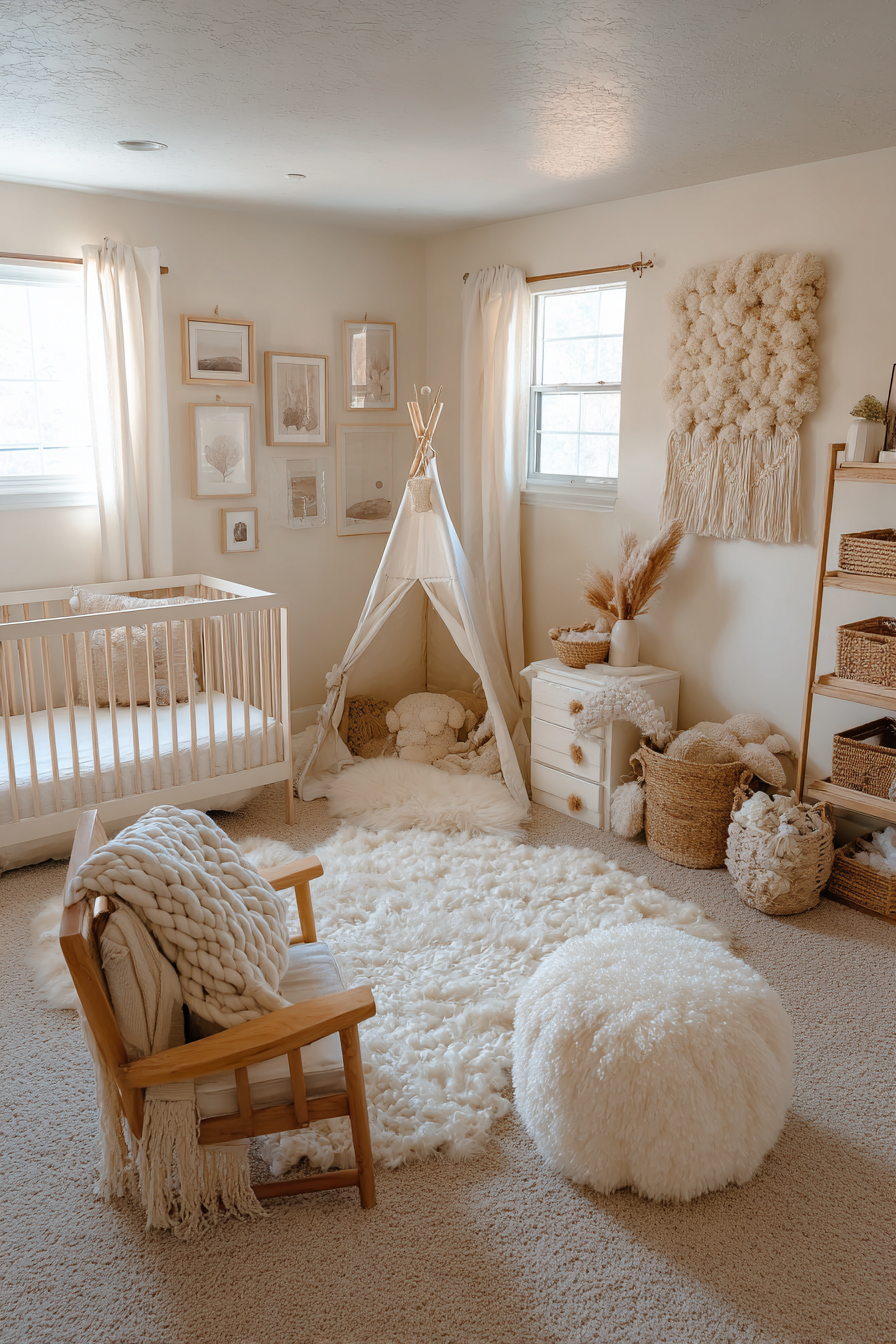 Hang a macramé wall hanging as soft sculpture, or add a sheepskin rug for cozy tummy time sessions. Install rattan storage baskets that bring organic texture while providing practical organization. Consider a velvet ottoman that serves as both seating and visual softness against harder surfaces like wooden floors and metal crib frames.