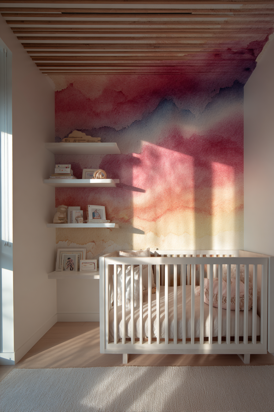 Paint techniques also work beautifully on ceilings. Try an ombre effect transitioning from deep twilight blue to soft morning pink, or create a subtle rainbow gradient. Glow-in-the-dark paint adds nighttime magic that soothes babies during those late-night wake-ups while providing just enough ambient illumination for parents.